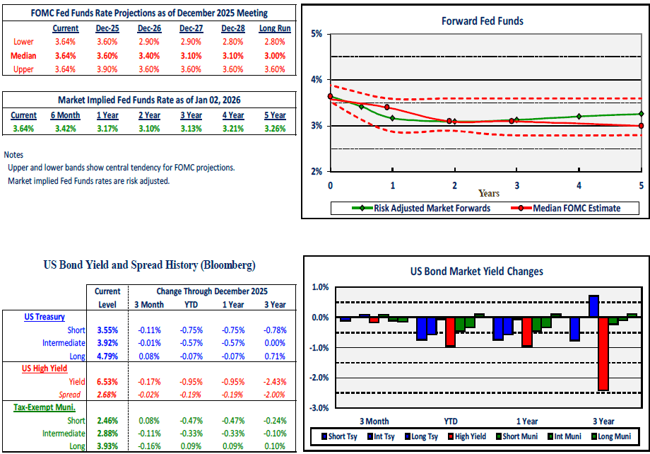 - The Fed still projects reducing policy rates toward a neutral posture over the coming 12-18 months and will also transition to a new Fed Chair, with Kevin Warsh’s pending appointment.