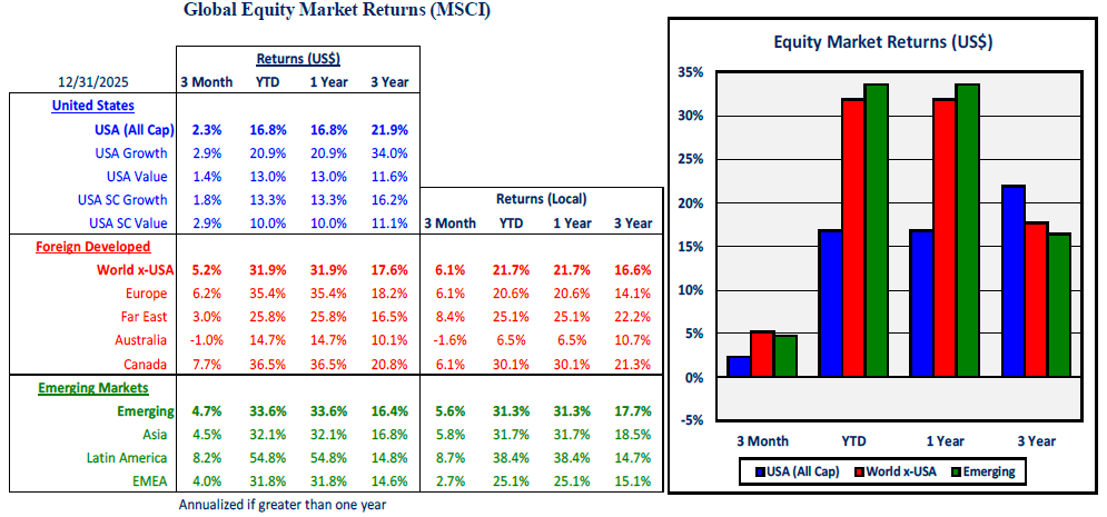 - For the full year in 2025, emerging markets finished ahead of developed markets (U.S. and non-U.S.) with significant contributions from each region.