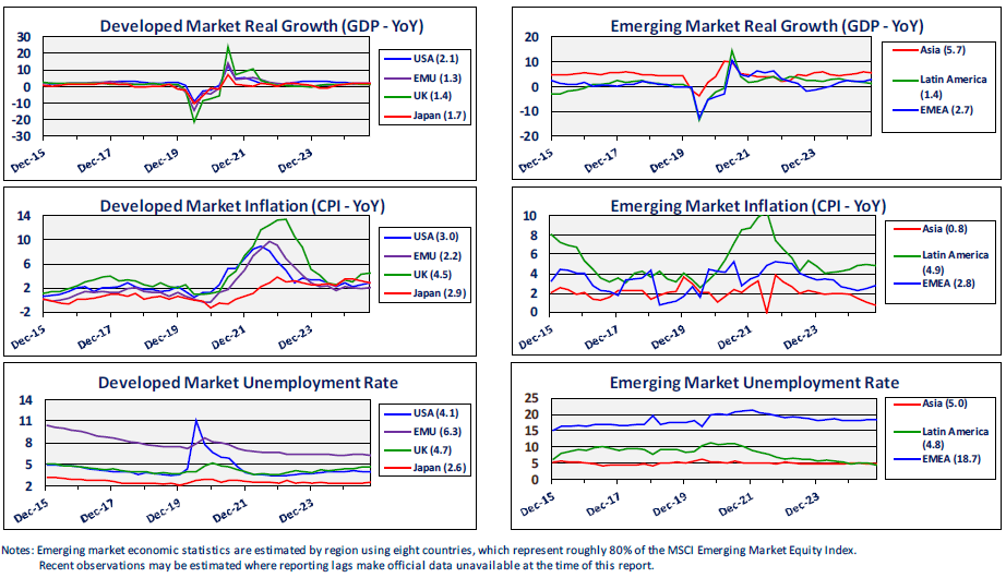 - While inflation ticked up and remained slightly above targets across major developed markets, it continued to decline across Asian emerging markets to levels that are well below the average of the past couple decades. A majority of global central banks, including the FED, cut policy rates during the quarter. Both the ECB and the Bank of Japan left policy rates unchanged in line with expectations.
